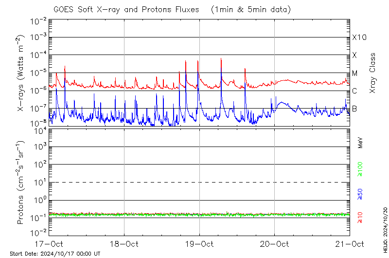 This page provides light-curves generated from GOES soft X-ray and Particle data for the date indicated at the top and the preceding three days.