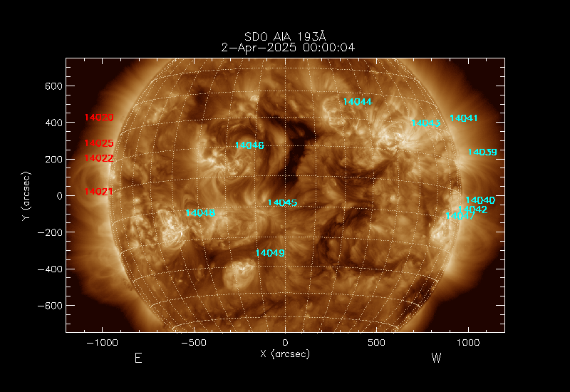 Click on an Active Region plot to display the Region Report including the region evolution and flaring history. HEC Search for NOAA Active Regions (SRS) records for this date and the day before.
