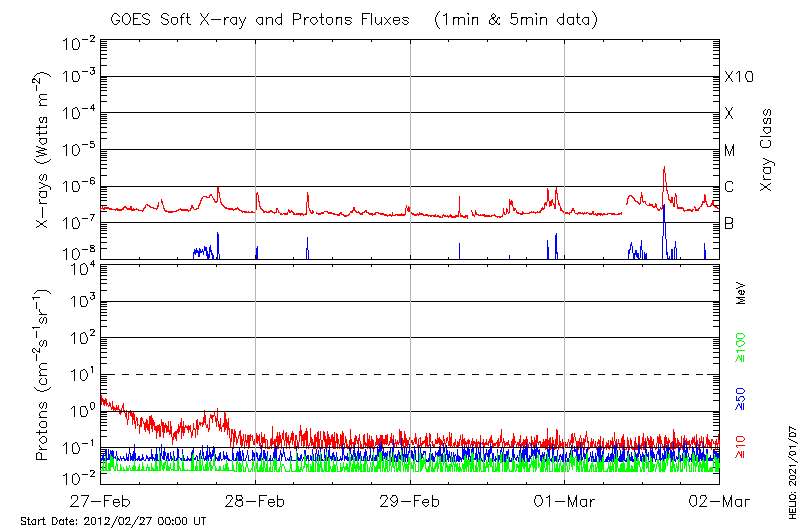 This page provides light-curves generated from GOES soft X-ray and Particle data for the date indicated at the top and the preceding three days.