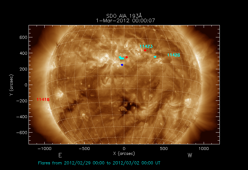 shows the locations soft X-ray flares that occurred within
