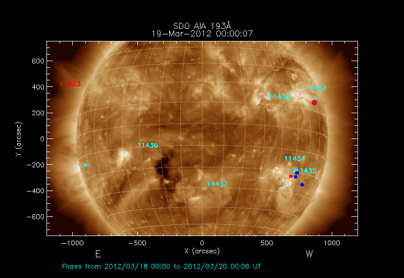 The most recent flares (≤12 hours) are shown as red dots, 12-24 hours ago as blue dots and older ones as turquoise dots.