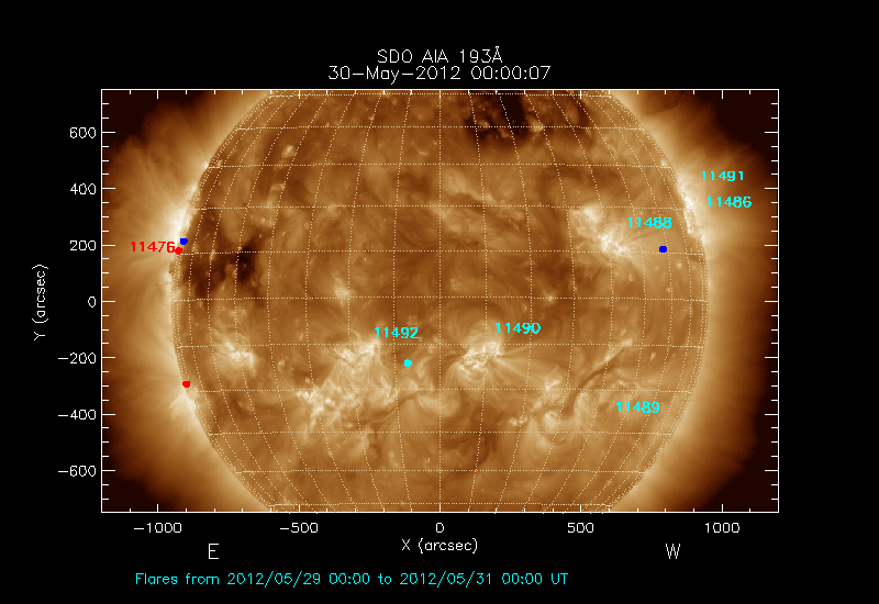 The most recent flares (≤12 hours) are shown as red dots, 12-24 hours ago as blue dots and older ones as turquoise dots.