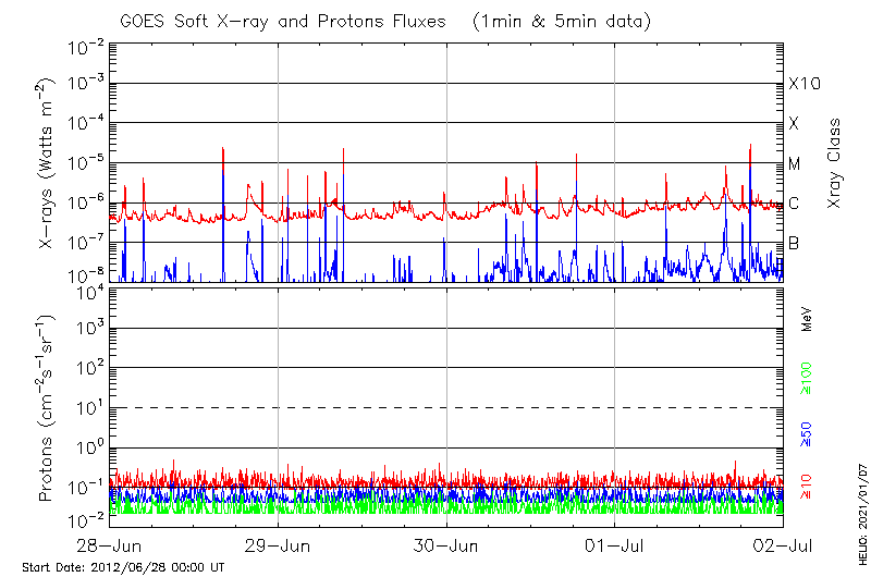 This page provides light-curves generated from GOES soft X-ray and Particle data for the date indicated at the top and the preceding three days.