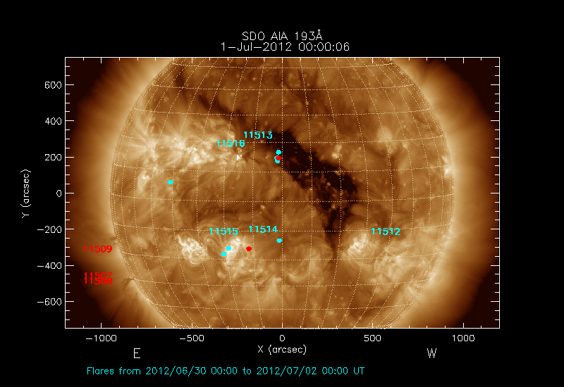 The locations of the flares over-plotted on the image are derived from the flare catalogue
