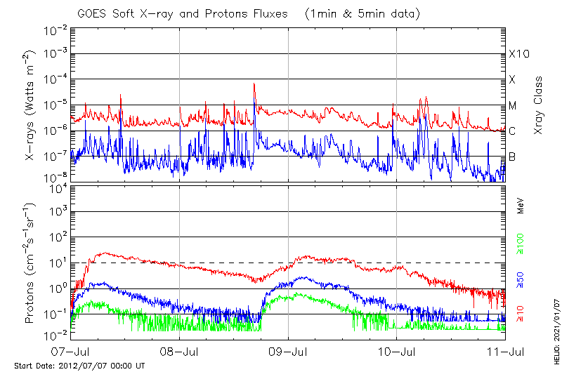This page provides light-curves generated from GOES soft X-ray and Particle data for the date indicated at the top and the preceding three days.
