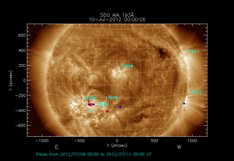 dots and 24-48 hours as turquoise dots; the flare locations are rotated to the time of the image.
