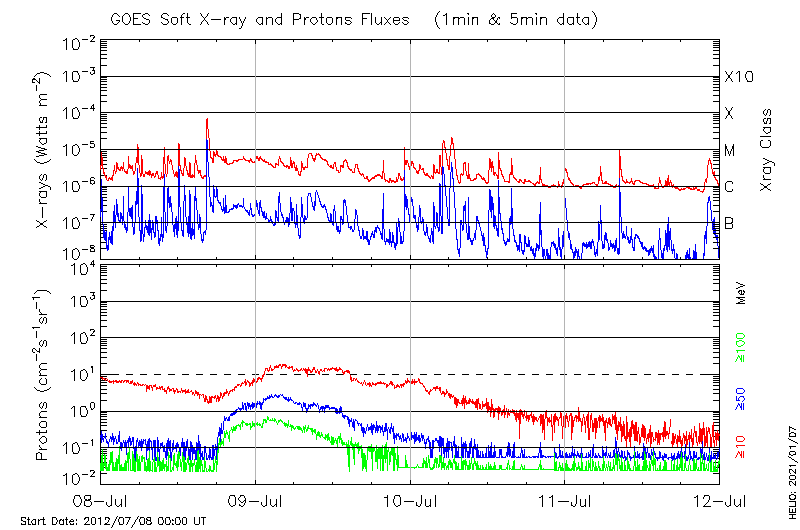 This page provides light-curves generated from GOES soft X-ray and Particle data for the date indicated at the top and the preceding three days.