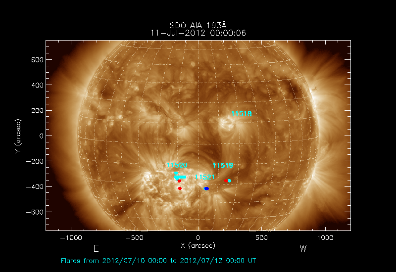The most recent flares (≤12 hours) are shown as red dots, 12-24 hours ago as blue dots and older ones as turquoise dots.