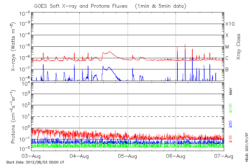 This page provides light-curves generated from GOES soft X-ray and Particle data for the date indicated at the top and the preceding three days.