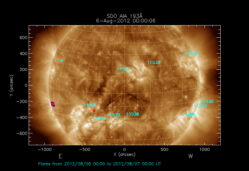 The most recent flares (≤12 hours) are shown as red dots, 12-24 hours ago as blue dots and older ones as turquoise dots.