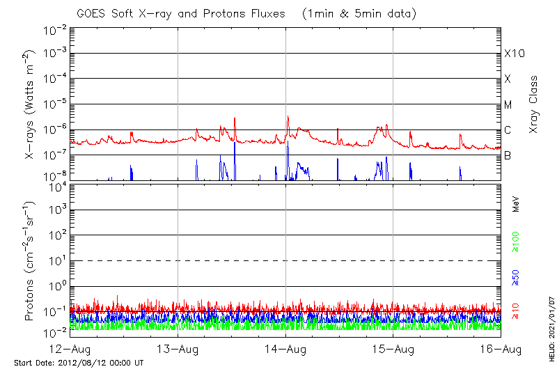 This page provides light-curves generated from GOES soft X-ray and Particle data for the date indicated at the top and the preceding three days.