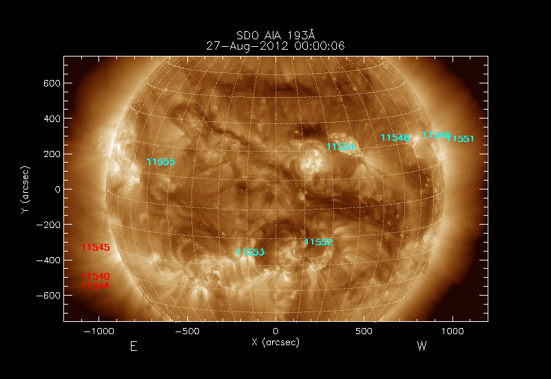 Click on an Active Region plot to display the Region Report including the region evolution and flaring history. HEC Search for NOAA Active Regions (SRS) records for this date and the day before.