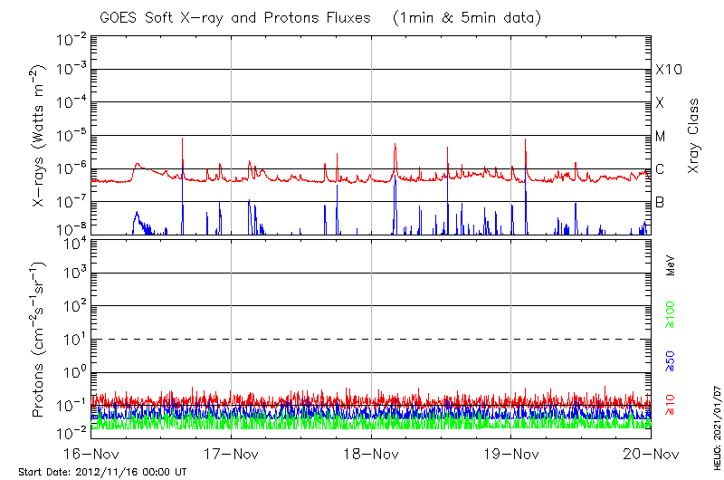 This page provides light-curves generated from GOES soft X-ray and Particle data for the date indicated at the top and the preceding three days.