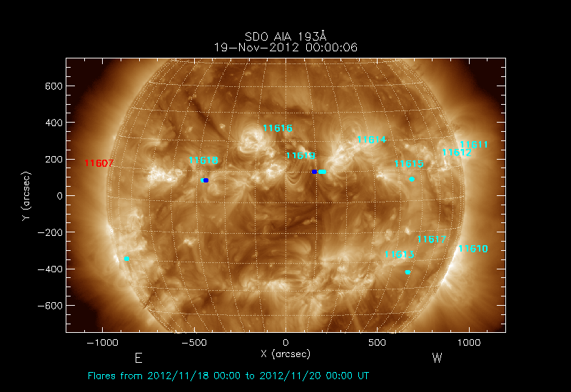 All soft X-ray flares (≥A1.0) where the location has been determined are shown; the flare locations are rotated to the time of the image