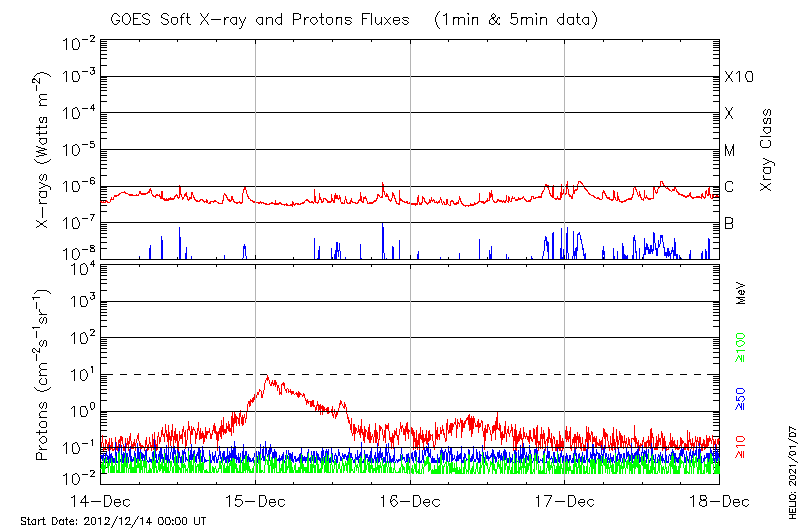 This page provides light-curves generated from GOES soft X-ray and Particle data for the date indicated at the top and the preceding three days.
