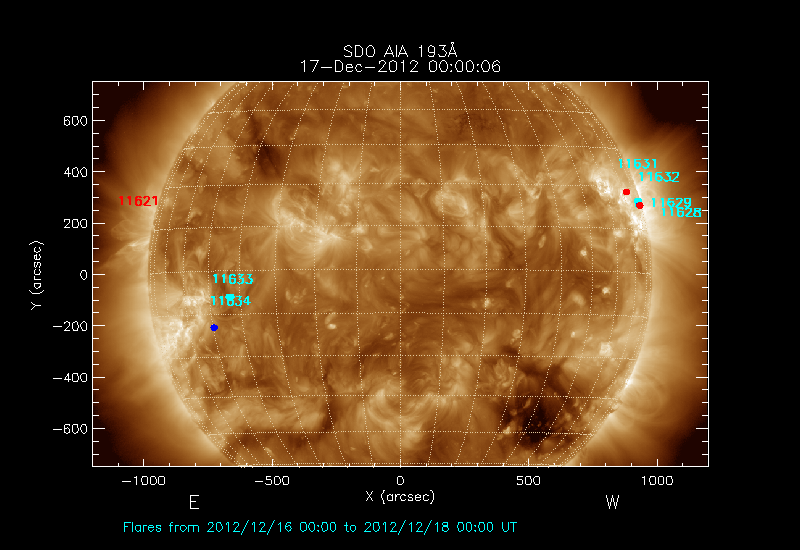 All soft X-ray flares (≥A1.0) where the location has been determined are shown; the flare locations are rotated to the time of the image