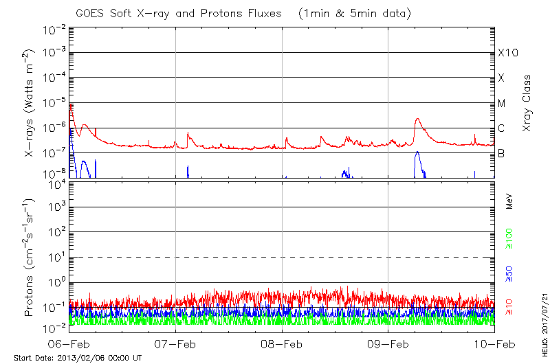 This page provides light-curves generated from GOES soft X-ray and Particle data for the date indicated at the top and the preceding three days.