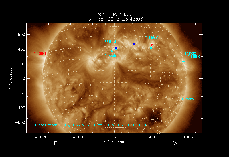 The locations of the flares over-plotted on the image are derived from the flare catalogue