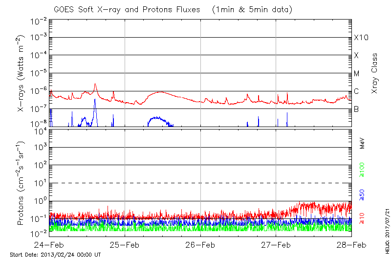 This page provides light-curves generated from GOES soft X-ray and Particle data for the date indicated at the top and the preceding three days.