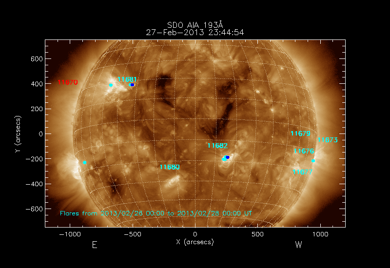 The locations of the flares over-plotted on the image are derived from the flare catalogue