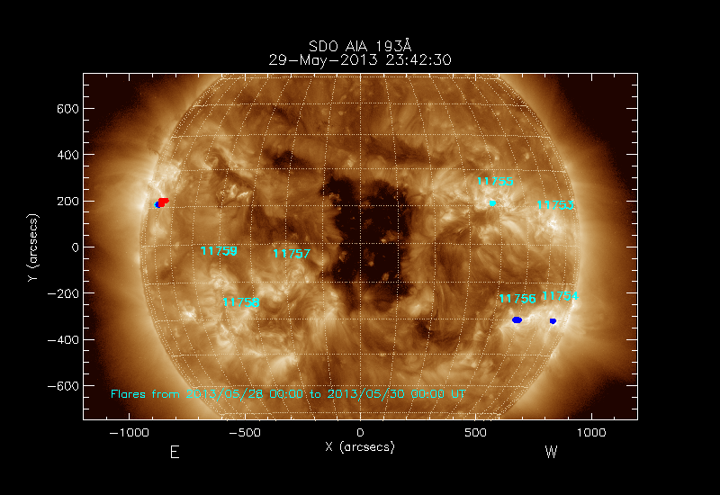 Click on an Active Region plot to display the Region Report including the region evolution and flaring history. HEC Search for NOAA Active Regions (SRS) records for this date and the day before.