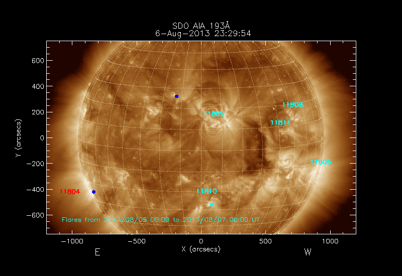 All soft X-ray flares (≥A1.0) where the location has been determined are shown; the flare locations are rotated to the time of the image