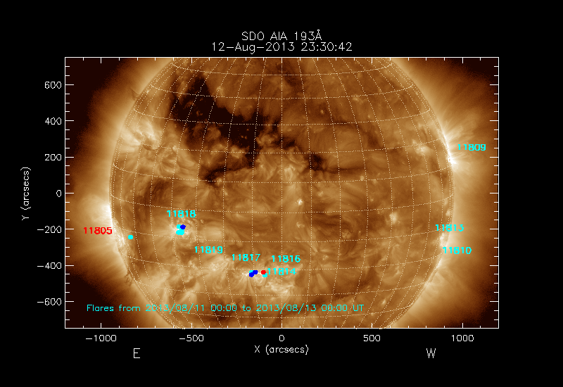 The most recent flares (≤12 hours) are shown as red dots, 12-24 hours ago as blue dots and older ones as turquoise dots.