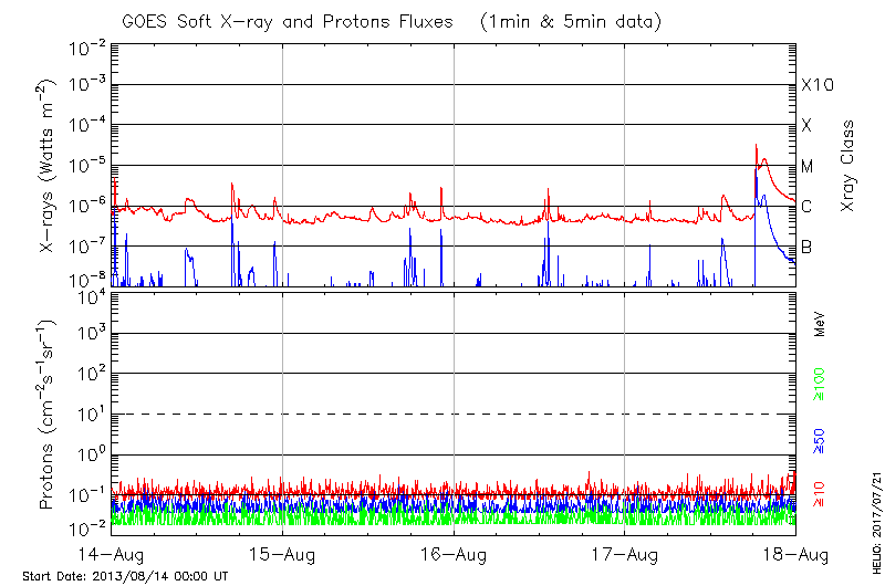 This page provides light-curves generated from GOES soft X-ray and Particle data for the date indicated at the top and the preceding three days.