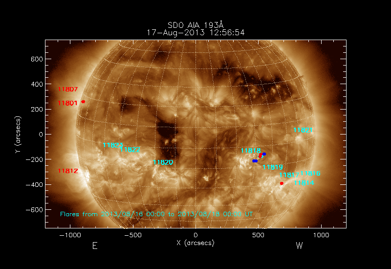 Click on an Active Region plot to display the Region Report including the region evolution and flaring history. HEC Search for NOAA Active Regions (SRS) records for this date and the day before.