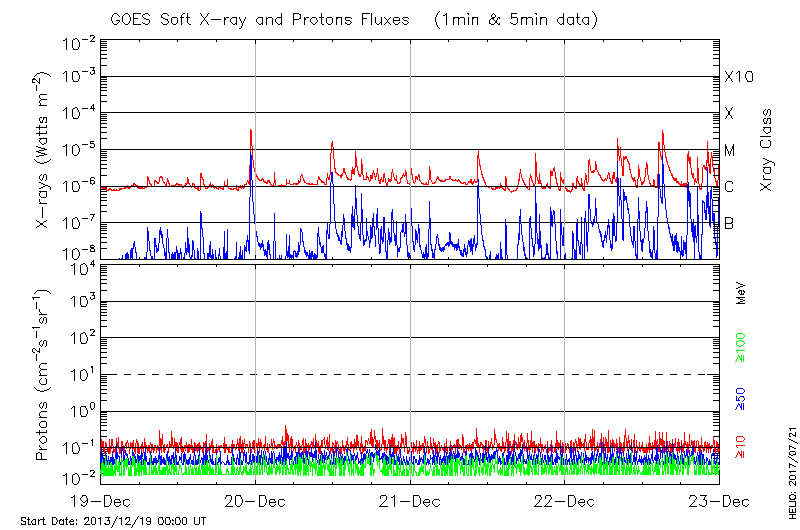 This page provides light-curves generated from GOES soft X-ray and Particle data for the date indicated at the top and the preceding three days.