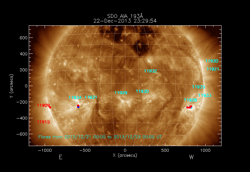 All soft X-ray flares (≥A1.0) where the location has been determined are shown; the flare locations are rotated to the time of the image