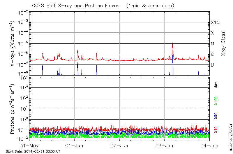 This page provides light-curves generated from GOES soft X-ray and Particle data for the date indicated at the top and the preceding three days.
