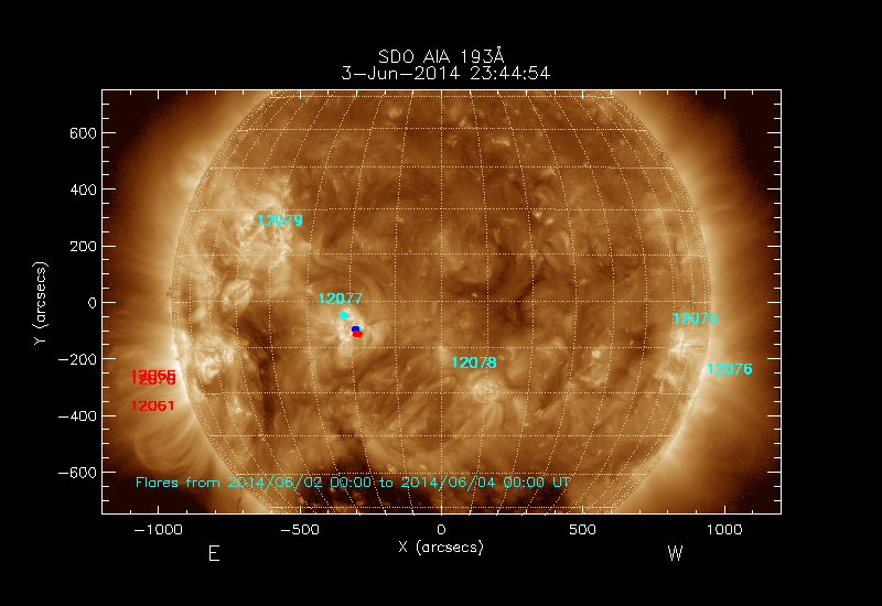 The locations of the flares over-plotted on the image are derived from the flare catalogue