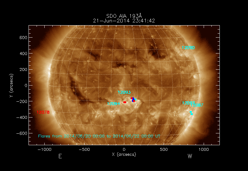 Click on an Active Region plot to display the Region Report including the region evolution and flaring history. HEC Search for NOAA Active Regions (SRS) records for this date and the day before.