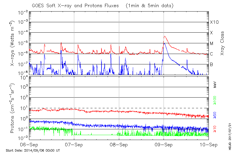 This page provides light-curves generated from GOES soft X-ray and Particle data for the date indicated at the top and the preceding three days.