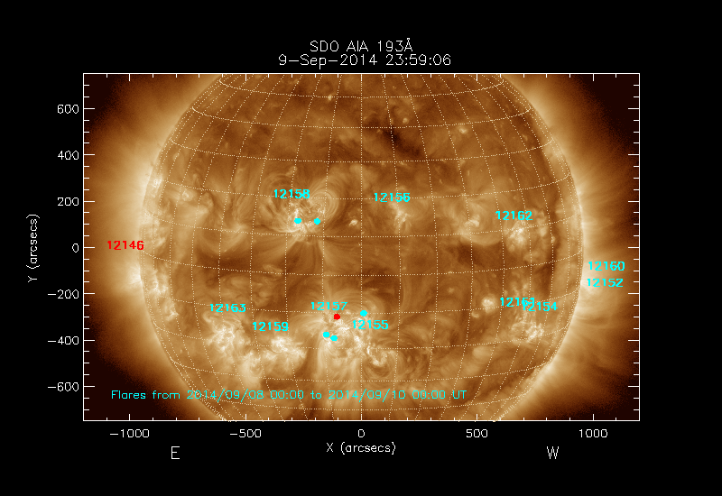 All soft X-ray flares (≥A1.0) where the location has been determined are shown; the flare locations are rotated to the time of the image