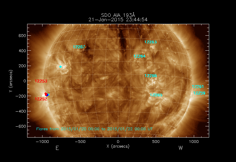 All soft X-ray flares (≥A1.0) where the location has been determined are shown; the flare locations are rotated to the time of the image