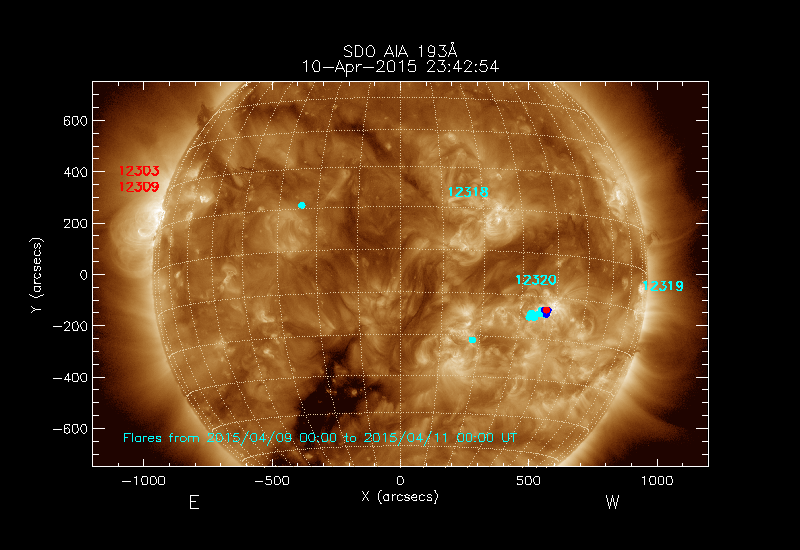 The most recent flares (≤12 hours) are shown as red dots, 12-24 hours ago as blue dots and older ones as turquoise dots.