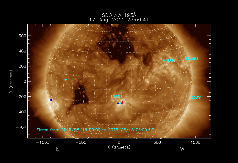 The most recent flares (≤12 hours) are shown as red dots, 12-24 hours ago as blue dots and older ones as turquoise dots.