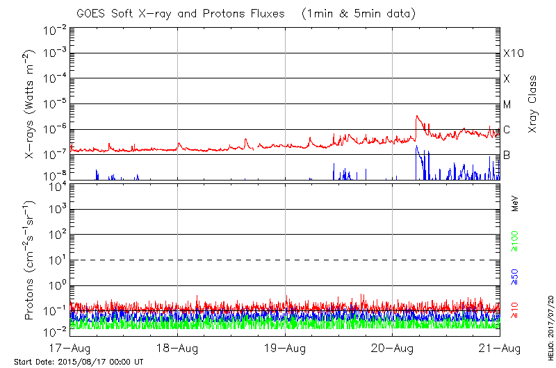 This page provides light-curves generated from GOES soft X-ray and Particle data for the date indicated at the top and the preceding three days.