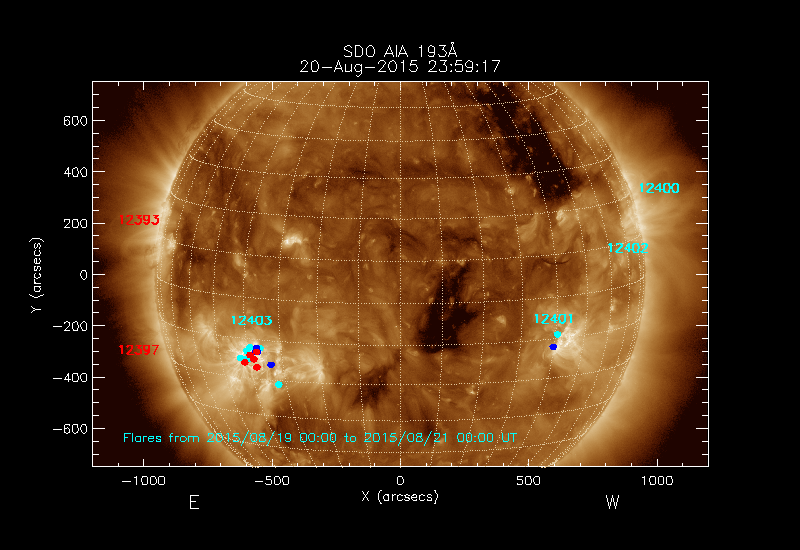 The most recent flares (≤12 hours) are shown as red dots, 12-24 hours ago as blue dots and older ones as turquoise dots.