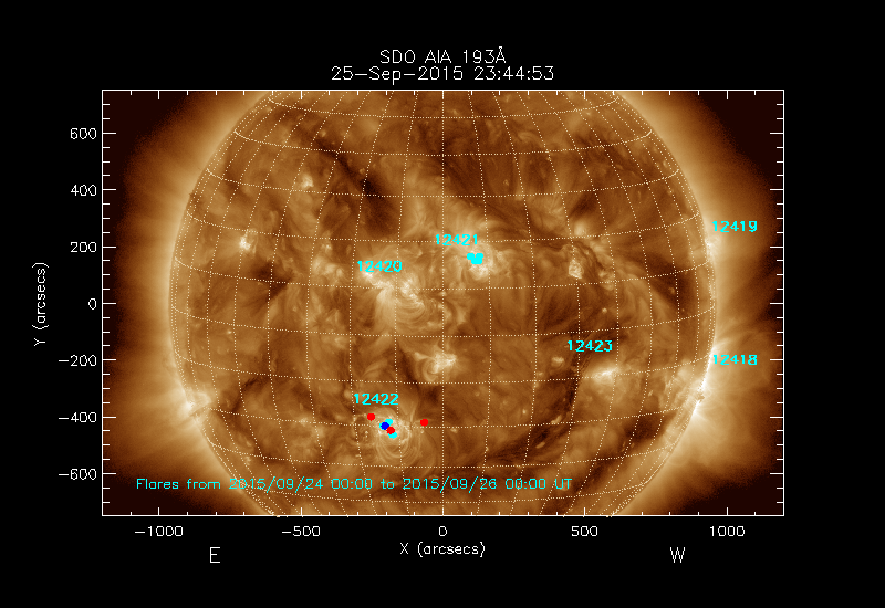 The most recent flares (≤12 hours) are shown as red dots, 12-24 hours ago as blue dots and older ones as turquoise dots.