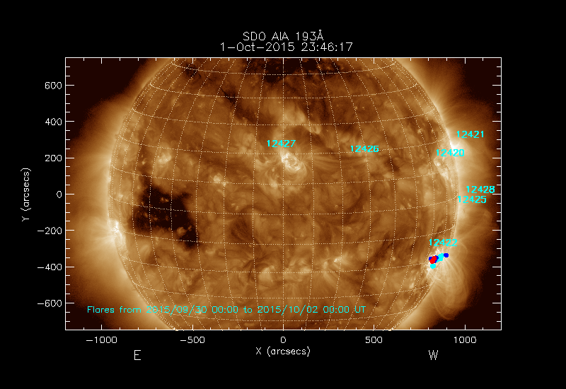 The most recent flares (≤12 hours) are shown as red dots, 12-24 hours ago as blue dots and older ones as turquoise dots.