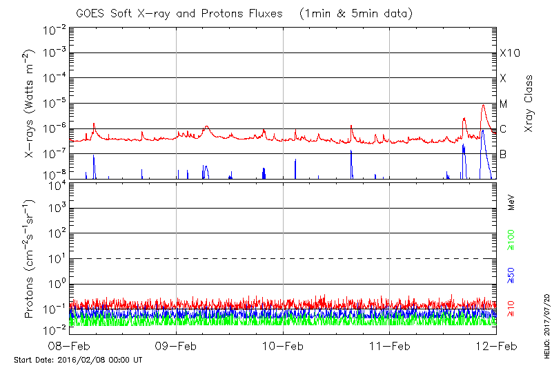 This page provides light-curves generated from GOES soft X-ray and Particle data for the date indicated at the top and the preceding three days.