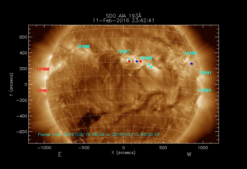 The most recent flares (≤12 hours) are shown as red dots, 12-24 hours ago as blue dots and older ones as turquoise dots.
