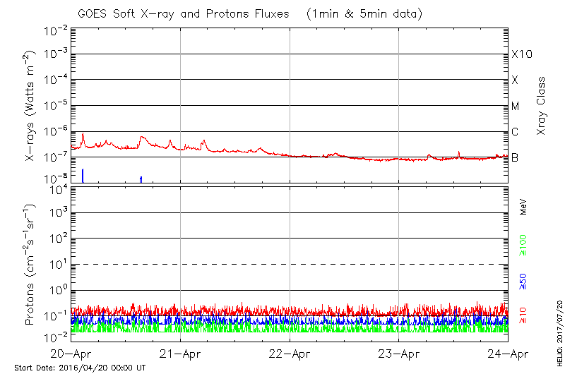 This page provides light-curves generated from GOES soft X-ray and Particle data for the date indicated at the top and the preceding three days.