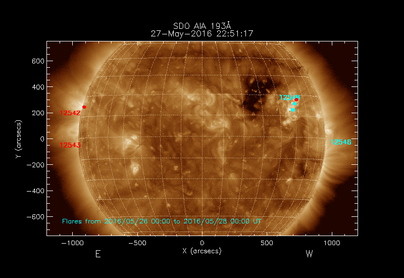 Click on an Active Region plot to display the Region Report including the region evolution and flaring history. HEC Search for NOAA Active Regions (SRS) records for this date and the day before.