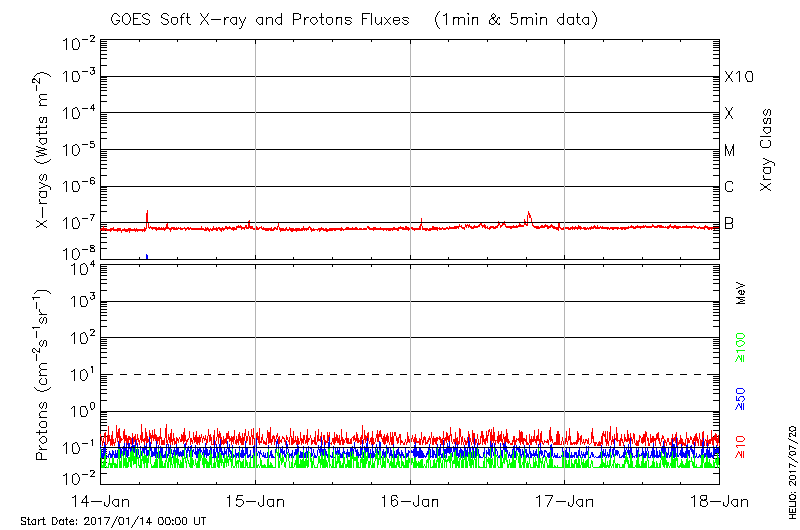 This page provides light-curves generated from GOES soft X-ray and Particle data for the date indicated at the top and the preceding three days.