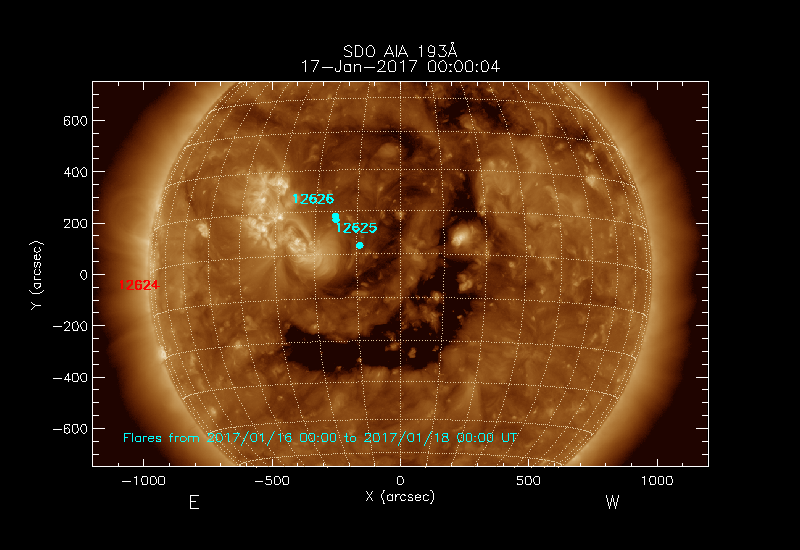 All soft X-ray flares (≥A1.0) where the location has been determined are shown; the flare locations are rotated to the time of the image