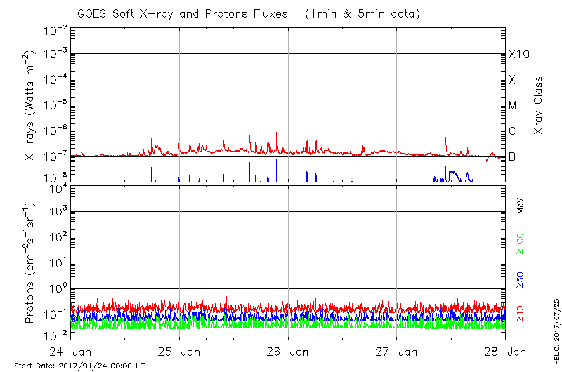 This page provides light-curves generated from GOES soft X-ray and Particle data for the date indicated at the top and the preceding three days.